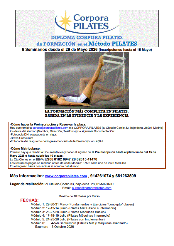 Te sugerimos recorrer la Web , que cada poco tiempo actualizaremos, y puedes comunicarte con nosotros por correo: info@corporapilates.com